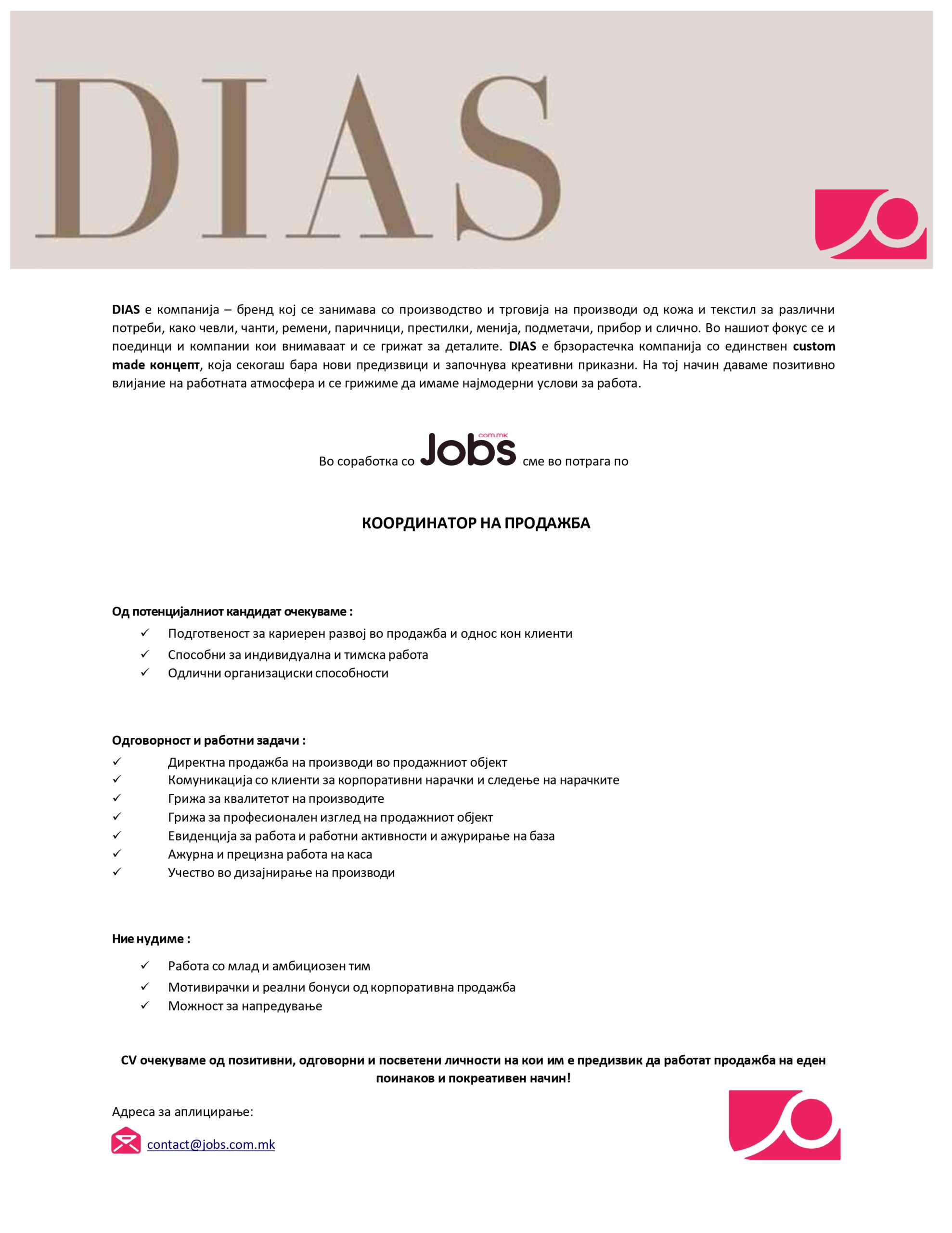 DIAS е компанија – бренд кој се занимава со производство и трговија на производи од кожа и текстил за различни потреби, како чевли, чанти, ремени, паричници, престилки, менија, подметачи, прибор и слично. Во нашиот фокус се и поединци и компании кои внимаваат и се грижат за деталите. DIAS е брзорастечка компанија со единствен custom made концепт, која секогаш бара нови предизвици и започнува креативни приказни. На тој начин даваме позитивно влијание на работната атмосфера и се грижиме да имаме најмодерни услови за работа.