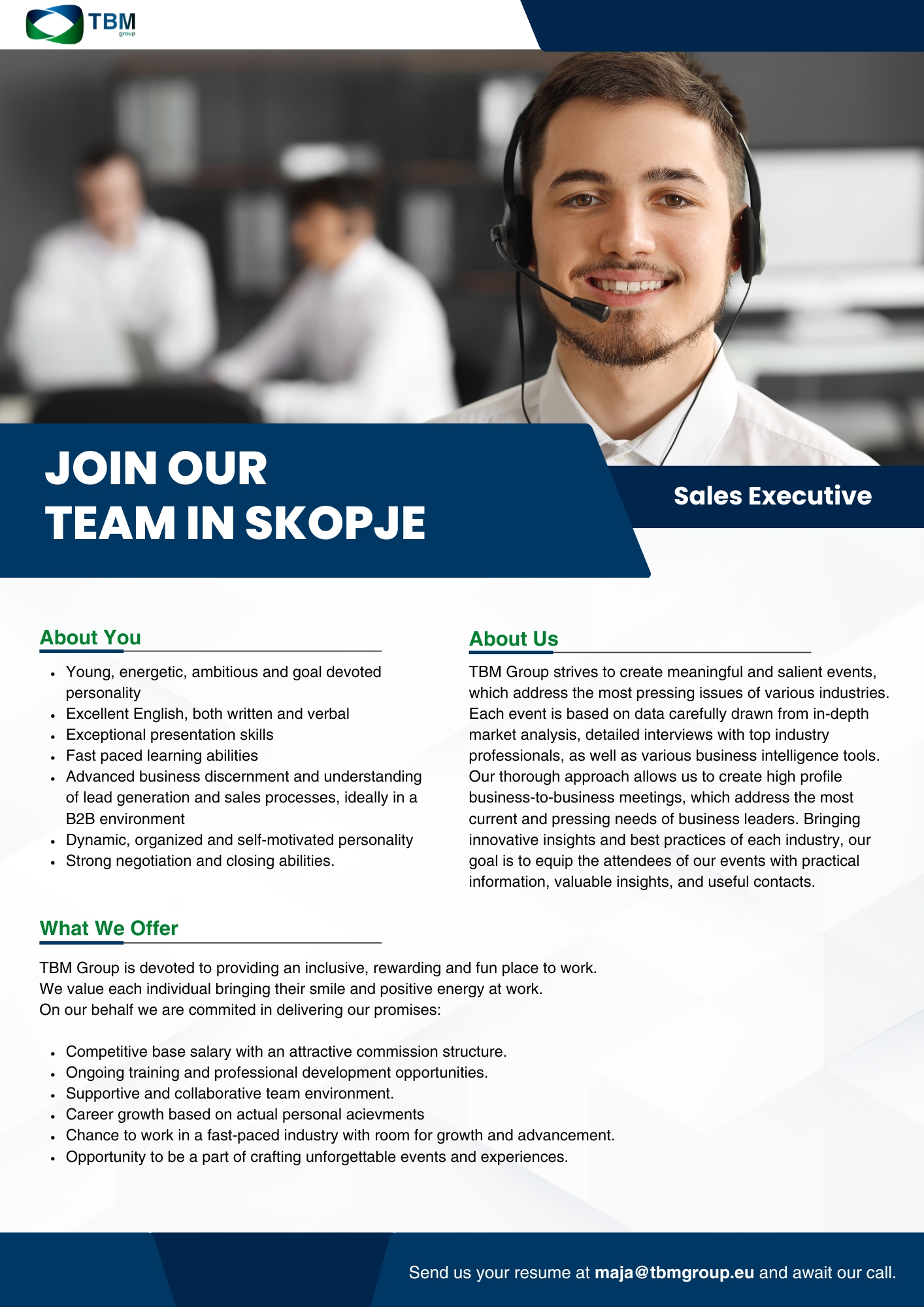ТБМ Гроуп е една од водечките европски компании за организација на висококвалитетни тематски бизнис конференции. Како динамична и интернационална средина, високо ги цениме различностите, иновативниот пристап и потенцијалот на нови таленти. Нашите тимови за бизнис развој се фокусирани на постигнување извонредни резултати, со постојано унапредување на стратешките вештини и деловните знаења. На мотивираните кандидати им нудиме можност за соработка со водечки глобални компании и продлабочување на експертизата во различни индустрии.